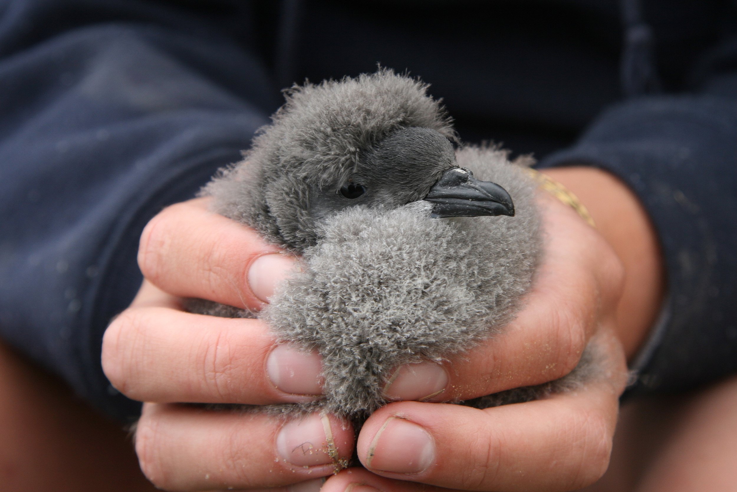 John and Liz with diving petrel during initial translocation (2012)